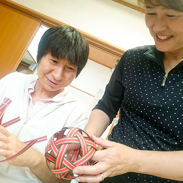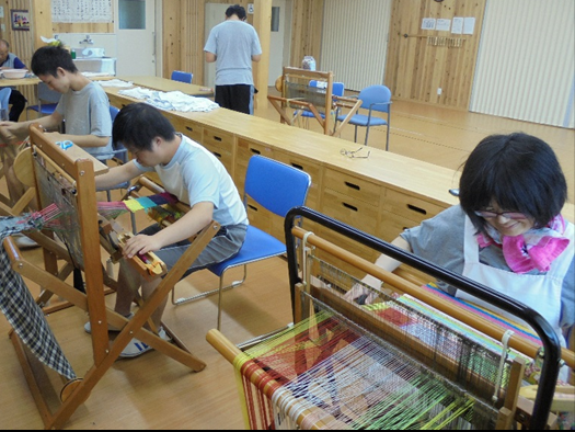 施設の利用者様が手織り機で織っている「さをり織り」を一緒に体験。機械織りとは違う”味”を体験してみよう。