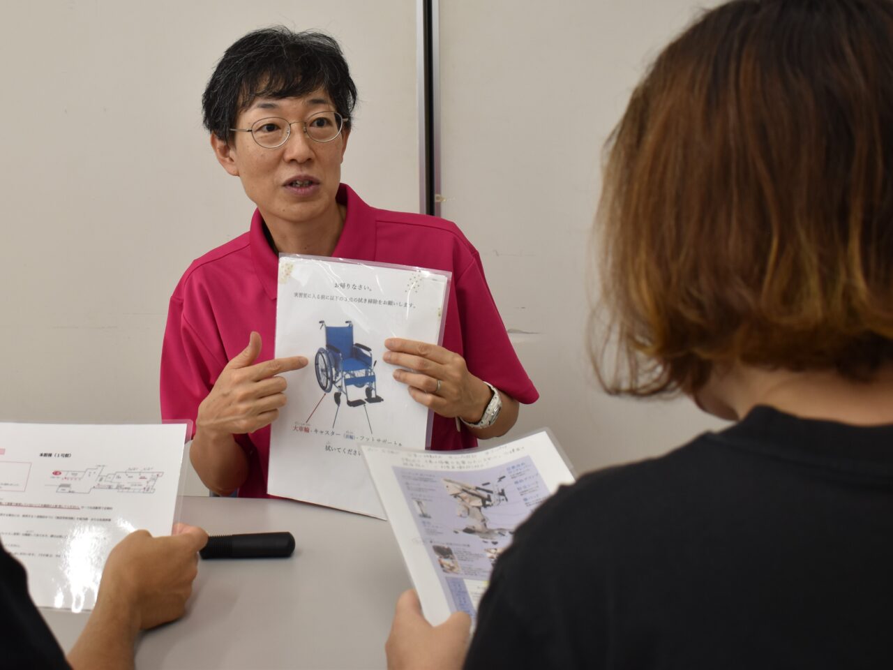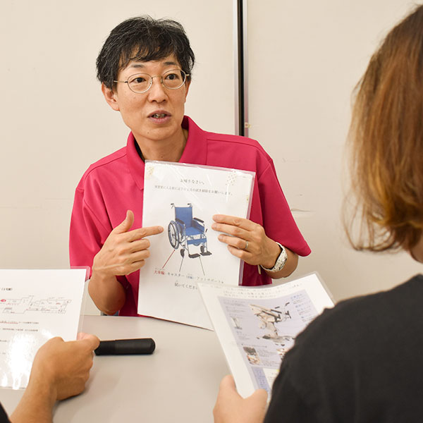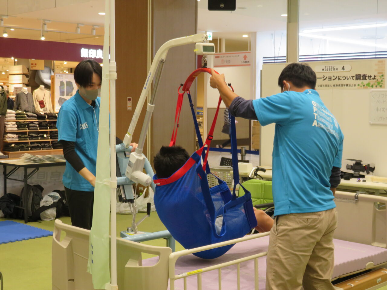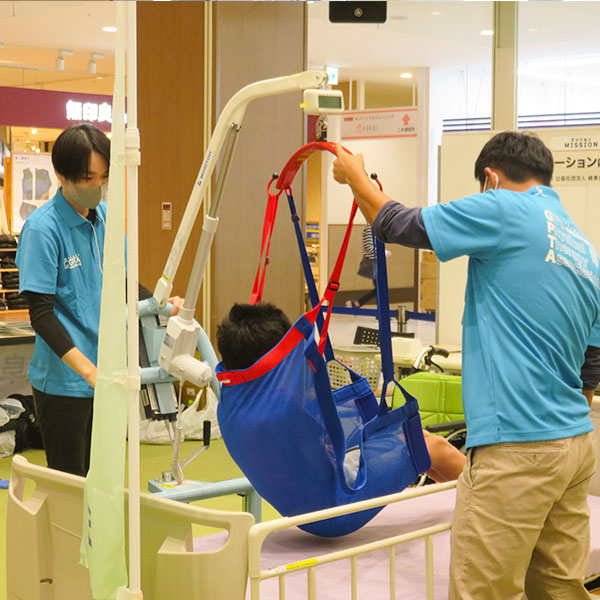 施設などで利用している「介護リフト」を使い、ベッドから車いすへの移動などを体験。理学療法士によるリハビリのお仕事についてお話を聞くことができます。