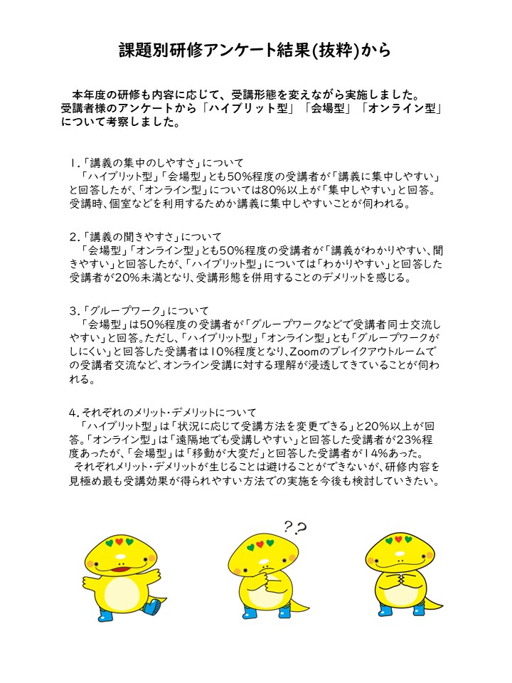 当センターでは、研修企画の際に皆様のご意見を参考にさせていただき、より良い研修をご提供できるよう努めております。今後とも、当センターの研修をご活用いただければ幸いです。