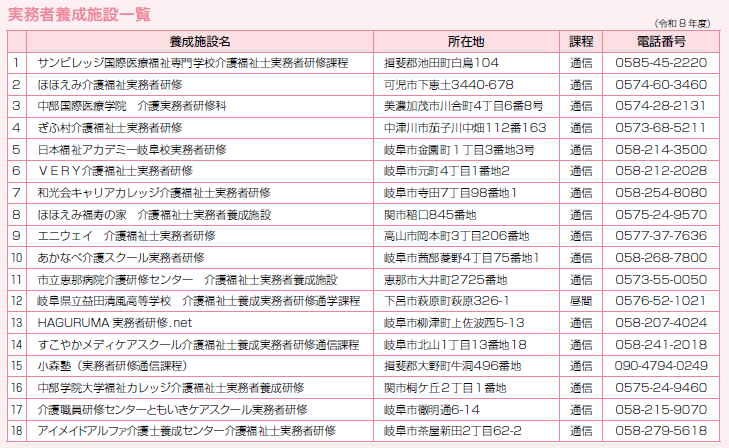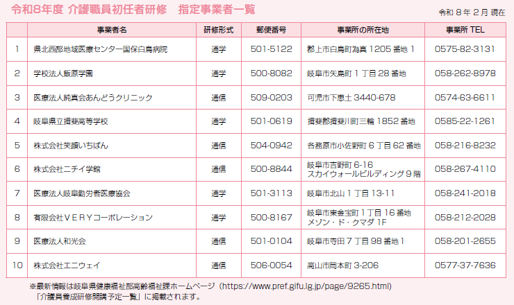 この研修は、訪問介護事業に従事しようとする者、もしくは在宅・施設を問わず、介護業務に従事しようとする者が対象となります。岐阜県では、厚生労働省の「介護員養成研修の取扱細則について」に基づいた「岐阜県介護員養成研修事業者指定要綱及び取扱要領」により、岐阜県知事に指定された事業者が研修を開催します。