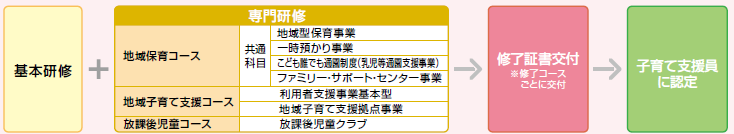 - 「地域保育コース」「地域子育て支援コース」「放課後児童コース」があり、研修修了者は「子育て支援員」として認定されます。
